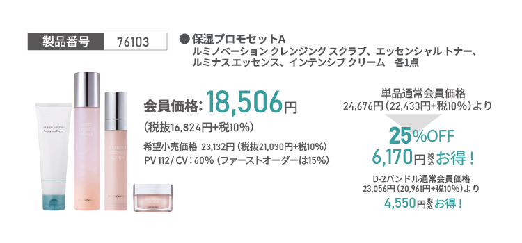 バンドルD-2(ルミノベーションのベーシックケア4点)と同じ内容が、ボディクリームの2本セットが、この期間中だけさらにお得な25%OFF!しっかりケアで顔もボディもぷるぷるお肌を目指しましょう。